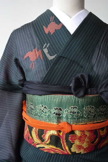 浴衣の替わりに着ても◎黒地に白ストライプ、紅白のとりさんが飛び交うキュートなお着物です^^*